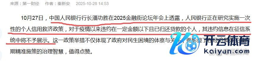 10月27日,央行行长潘功胜在2025金融街论坛年会上示意,央行正在盘问实施一次性的个东说念主信用施济计策,关于新冠疫情以来失约在一定金额以下且已反璧贷款的个东说念主失约信息,将在征信系统中不予展示,该设施绸缪在来岁头推行。