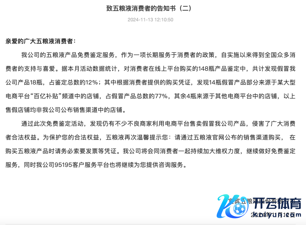 记者从五粮液官网获悉,五粮液发布的《致五粮液糜掷者的示知书(二)》涌现,该公司抵糜掷者在线上平台购买的148瓶家具飞舞中,假冒家具占比达12%。