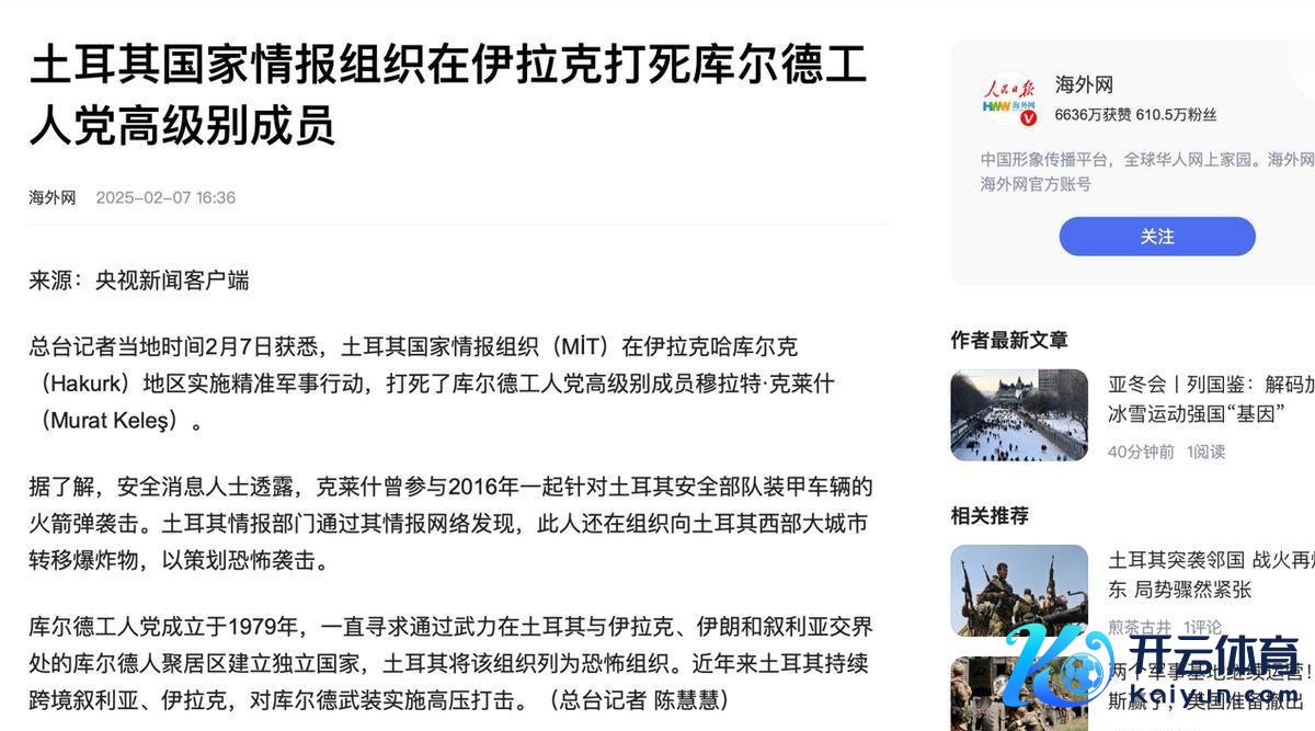 不外,土耳其的当作可不啻这些。2月7日,土耳其国度谍报组织对库尔德工东谈主党发起了一次精确打击,平直干掉了该组织的高等成员克莱什。库尔德工东谈主党持久盘踞在土耳其边境,空想着建设一个孤独的库尔德国度,但土耳其对此坚决不招待。多年来,土耳其对库尔德工东谈主党一直袭取高压政策,此次迫切昭彰是土耳其标明格调的要紧信号。